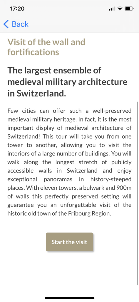 Leveraging a unique military heritage, the town of Fribourg offers now in its mobile application Fribourg Tourism AR a module dedicated to the discovery of the fortifications. A tour with 25 points-of-interests is accessible via a geo-localized map and it allows visitors to discover the remains of the wall and the 11 towers still in place. At each stop the visitor can access a detailed fact sheet. The module is available in English, French and German.